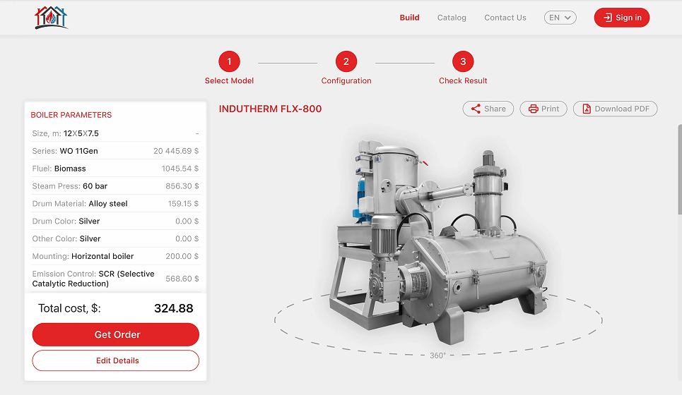 2D and 3D configurators simulate equipment based on input parameters, display results in real time, and generate specifications, estimates, technical requirements, and DXF drawings compatible with AutoCAD.