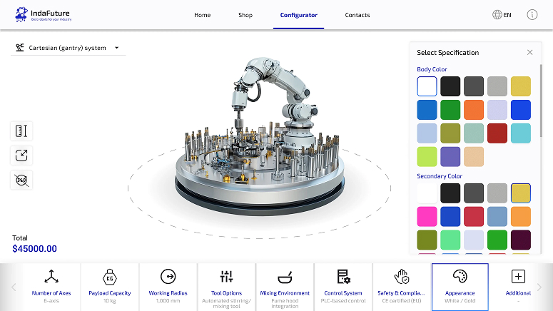 Configure dimensions, materials, drives, and operational parameters with real-time model updates.